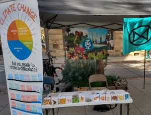 Information tables, booths, tents etc. in public places that anyone can come up to for information, conversations, interviews etc. Differs from “tabling” in that tabling is usually associated with particular events and promoting particular positions, actions or organizations while “Climate Corners” are meant more to be of service to the public, a place to be heard and to get information.